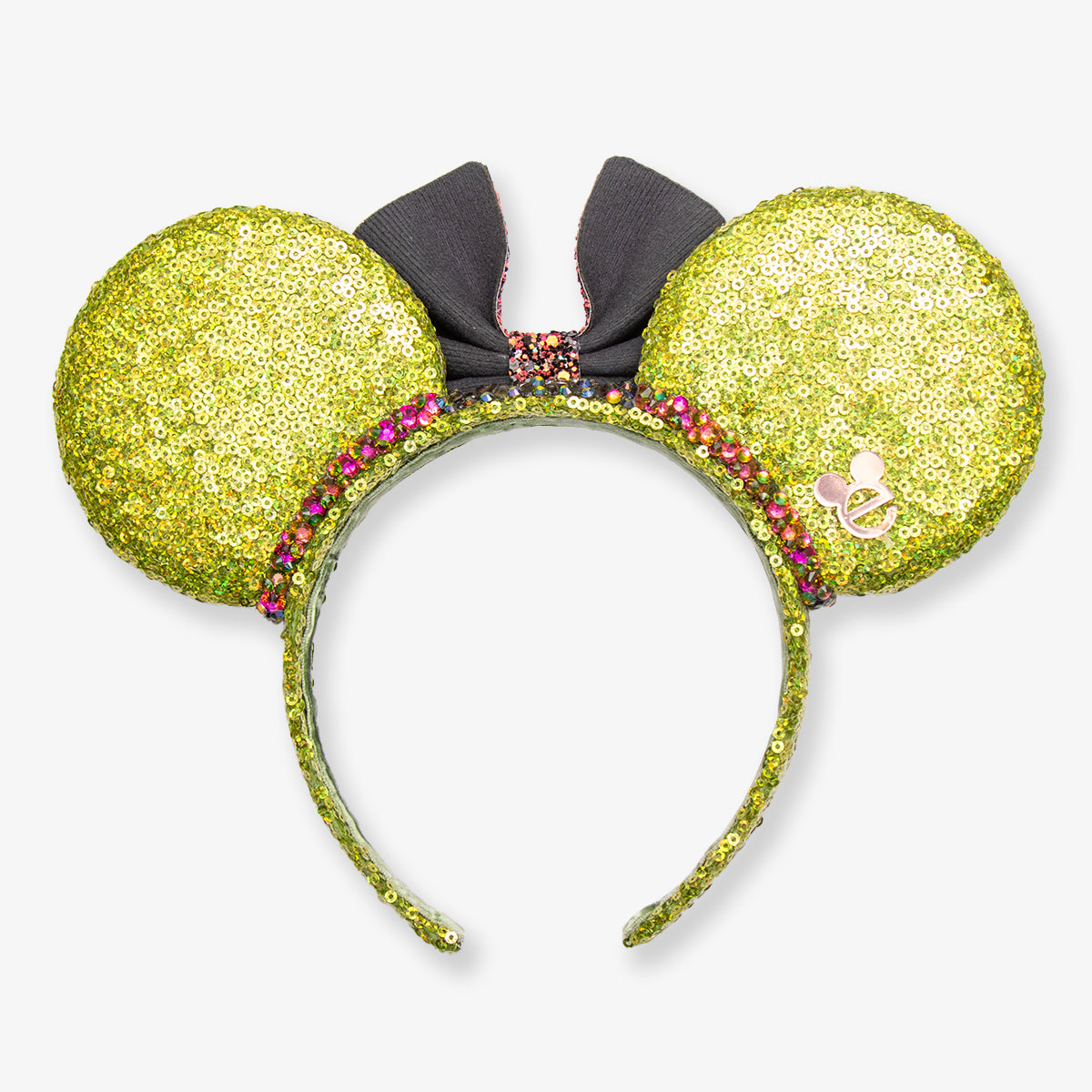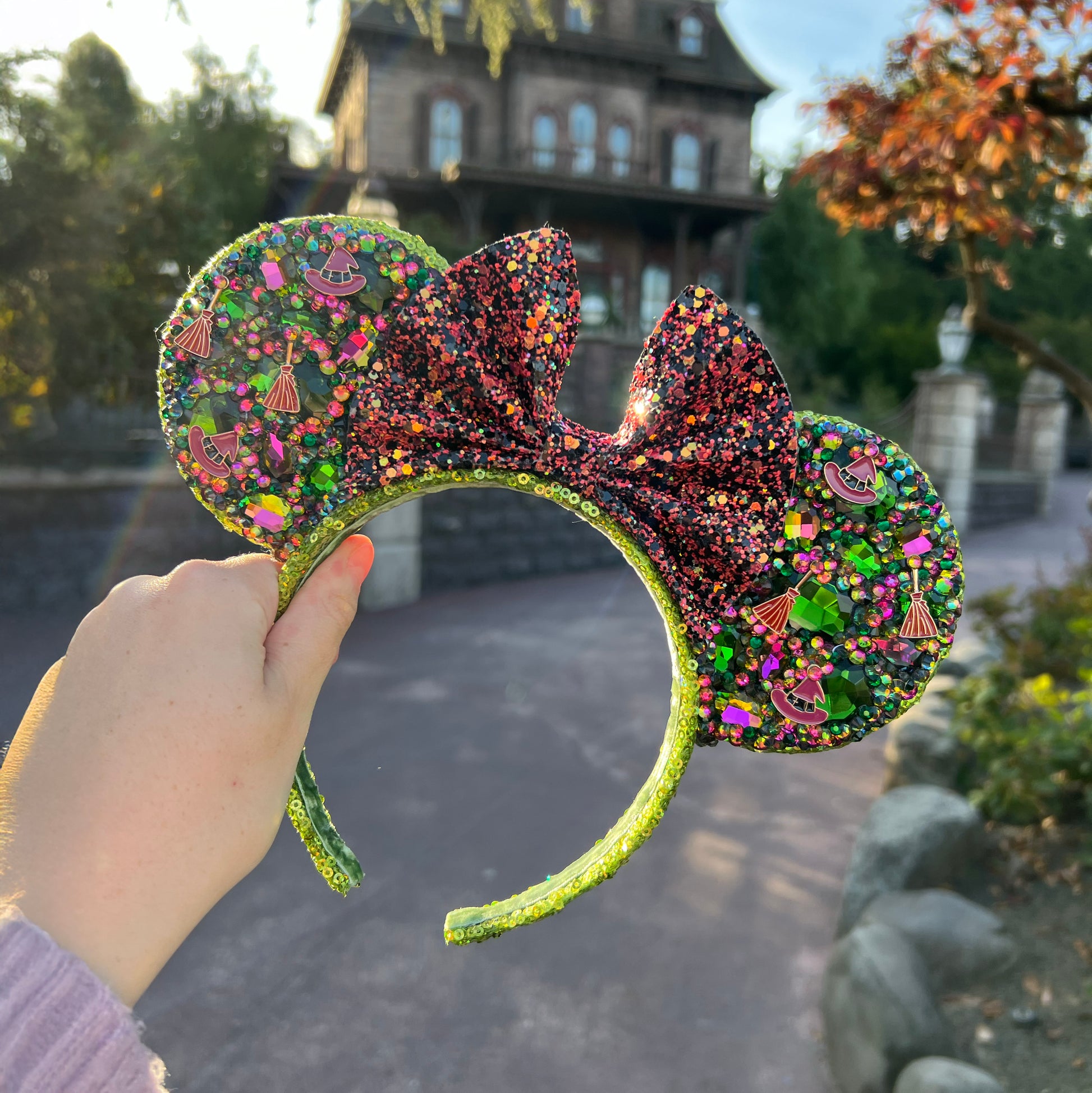Exquisite crystal glass mouse ears, in colours of green, purple & AB purple, with broomstick & hat embellishments. Encrusted on a green holographic sequin base, with a black & purple glitter bow and matching sequin headband.