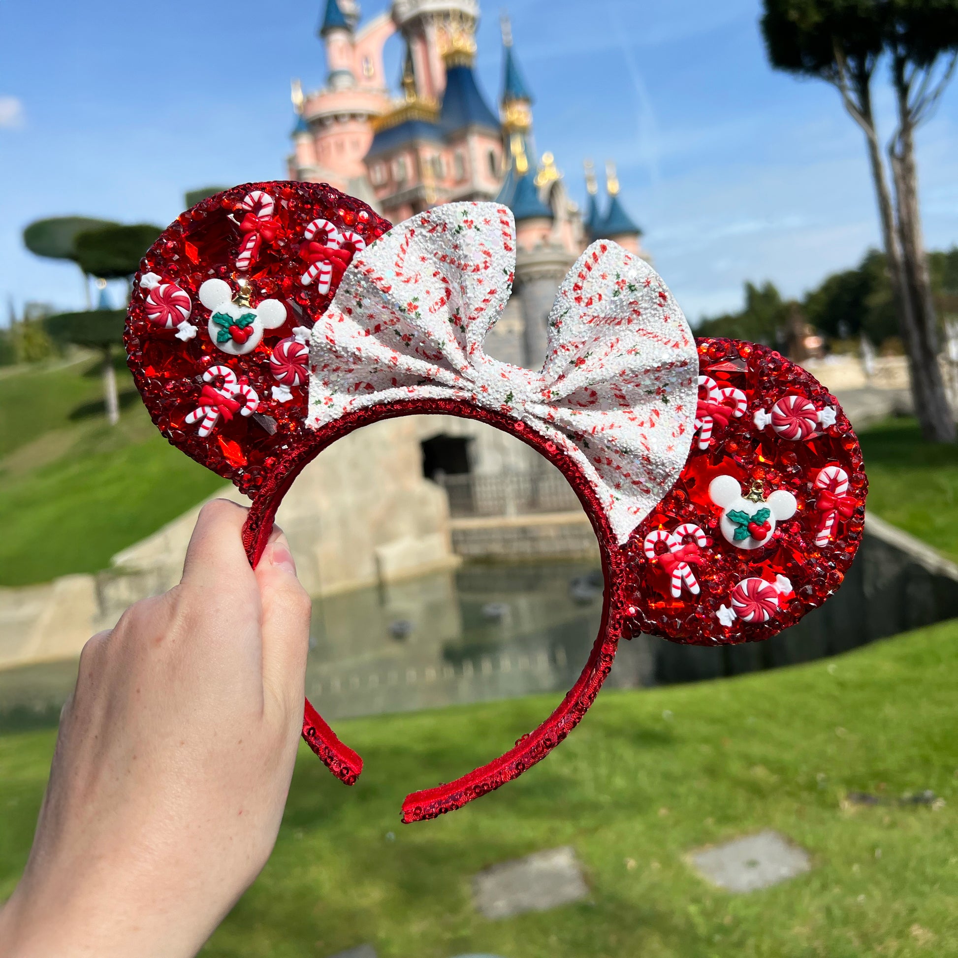Rhinestone mouse ears, in a festive red and white colour theme, with Holiday season embellishments. Encrusted on a sparkling red sequin base, with a white candy cane print glitter bow and matching sequin headband.