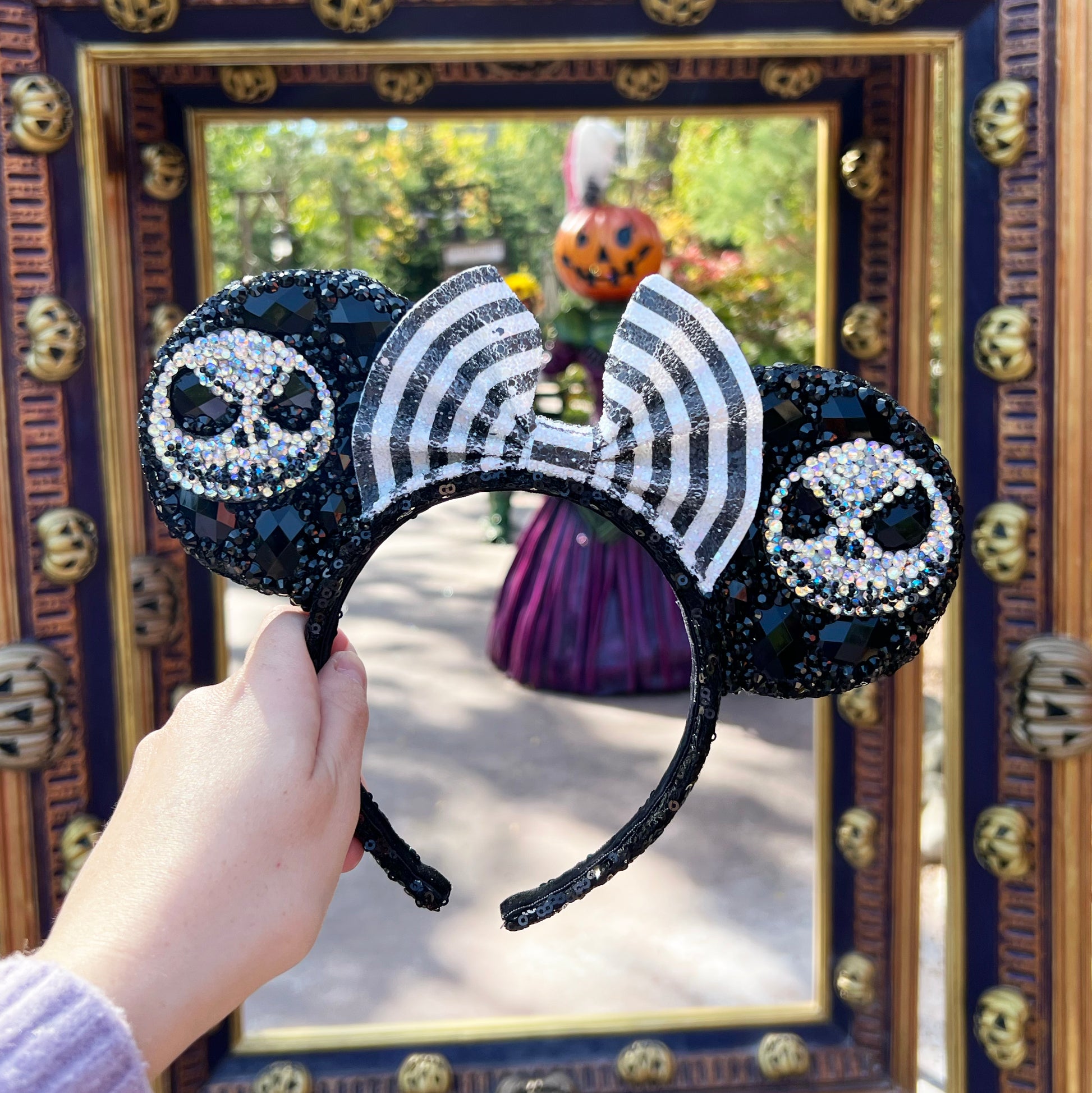 Rhinestone crystal mouse ears, in colours of black & AB Moonstone with character embellishments. Encrusted on a sparkling black sequin base, with a black and white striped glitter bow and matching sequin headband.