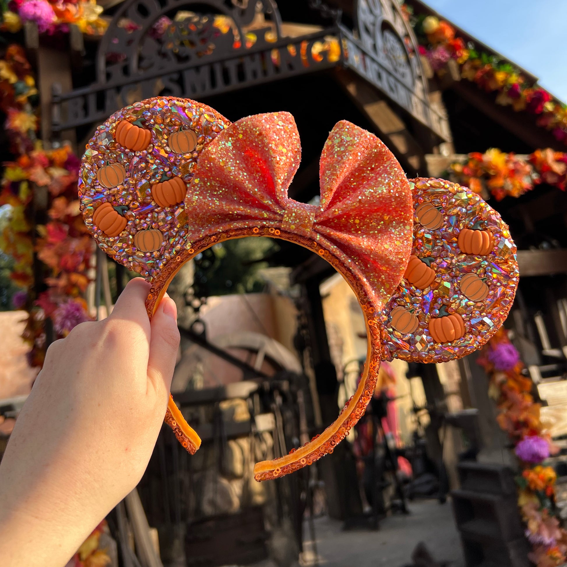Rhinestone mouse ears, in colours of AB orange with seasonal pumpkin embellishments. Encrusted on a sparkling orange sequin base, with an orange glitter bow and matching sequin headband.